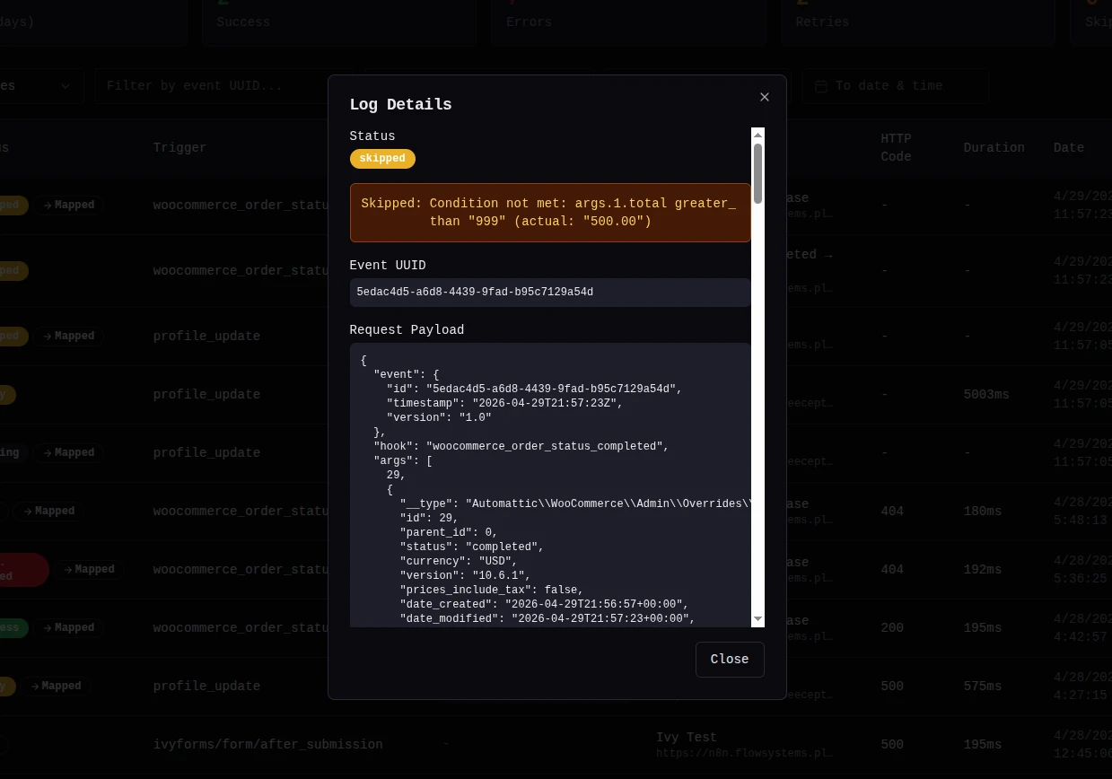 args.1.total was 500.00, below the 999 threshold.Here is the full payload your n8n webhook receives — captured from a real order on this site. The order total is 1000.00, just above the 999 threshold, so this event would pass the condition and be delivered.