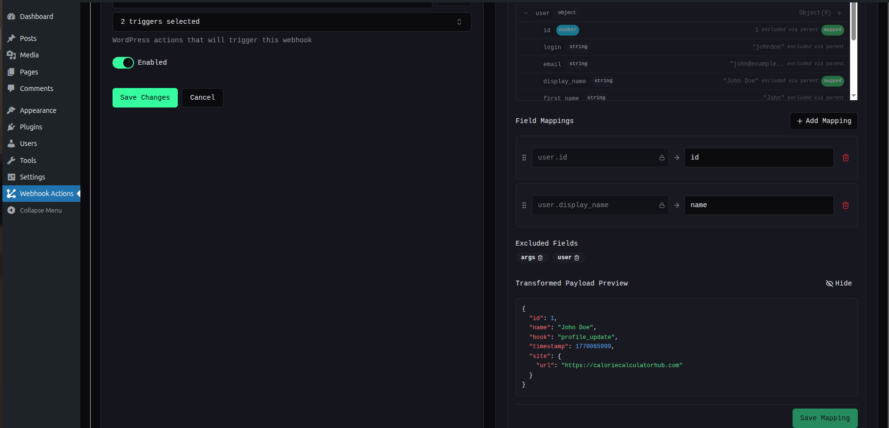 Payloads follow a consistent structure: hook name, arguments, timestamp, site URL. Field mapping lets you reshape data for any external schema.