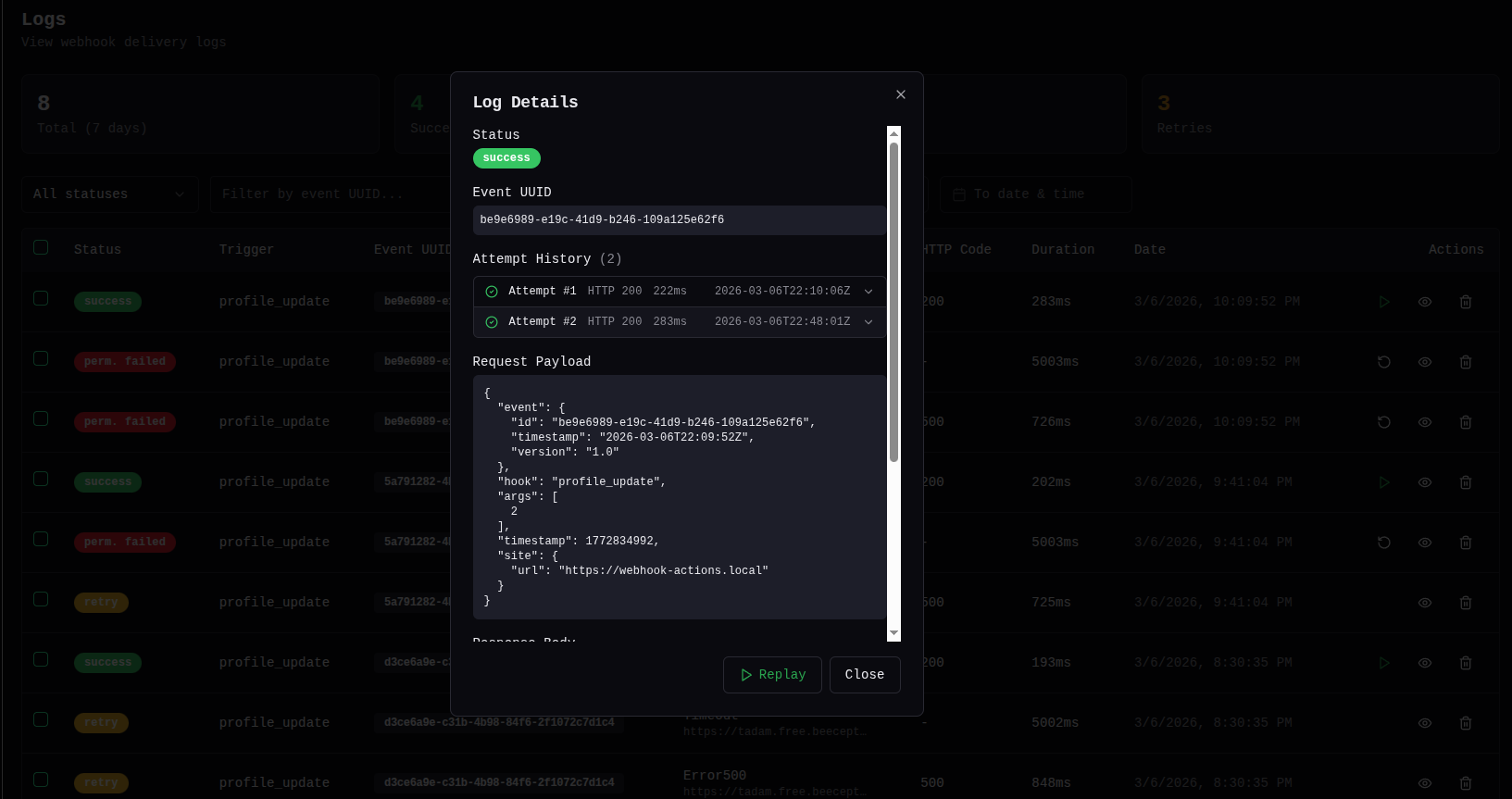Failed deliveries retry with increasing delays: 1 min, 2 min, 4 min, 8 min — up to 1 hour. Default 5 attempts, configurable via filter. For a full walkthrough of retry and replay architecture, see Inside My Webhook Retry & Replay System.