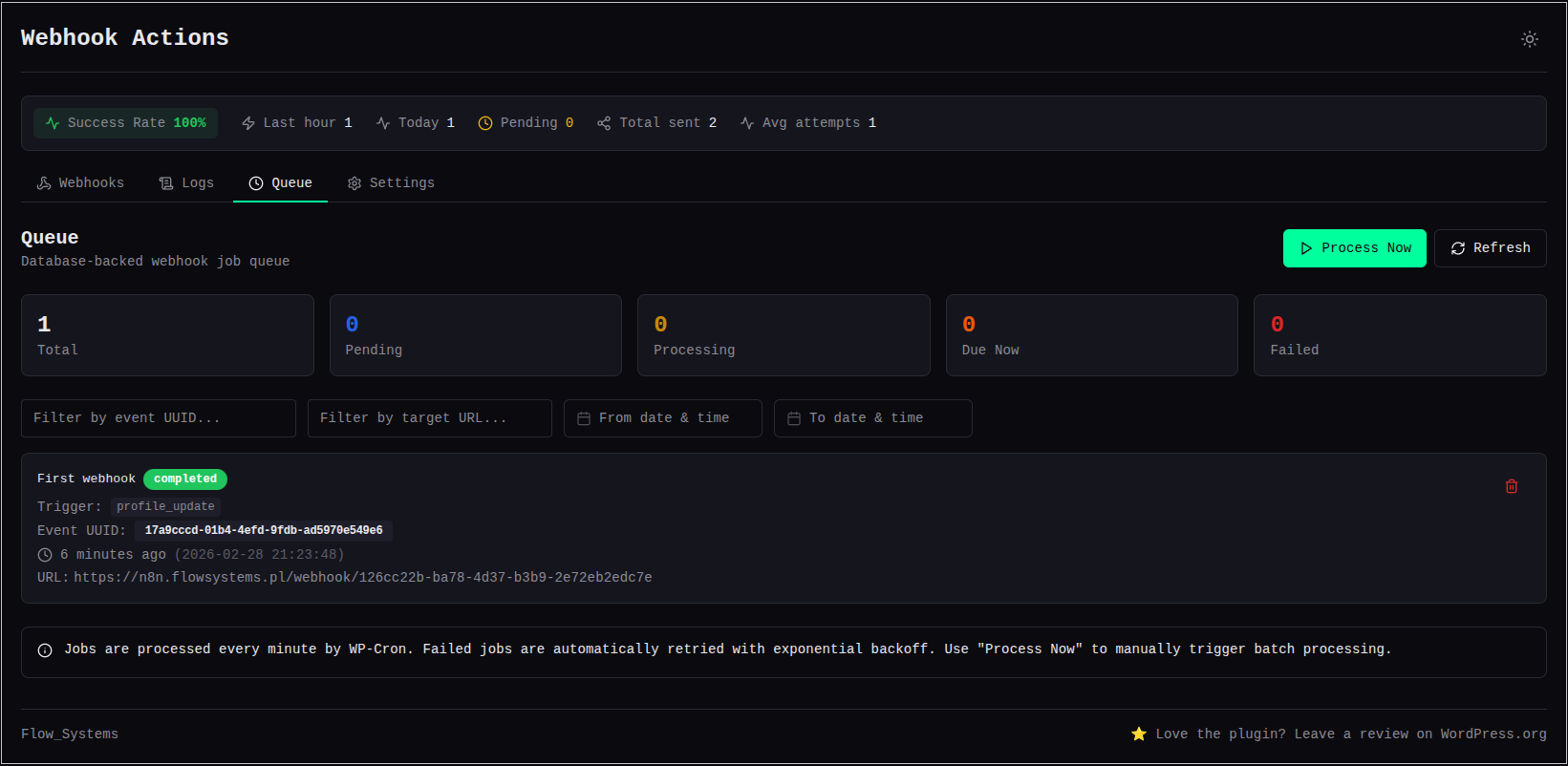Jobs are queued in a custom database table and processed in batches. Designed for system cron or a token‑protected REST endpoint for reliable, high‑frequency processing — with WP‑Cron as a fallback. For a deeper look at why WP‑Cron isn’t reliable for background jobs and how async webhook queues improve reliability and scalability in WordPress, see our technical article: Async Webhooks in WordPress — Why WP‑Cron Is Not Enough. To set up a proper cron job for WordPress — including system crontab, WP-CLI, and Action Scheduler — see Cron Job for WordPress: WP-Cron Limits and Real Fixes.